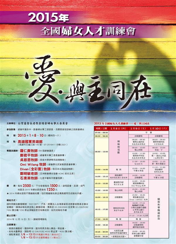 Ø 費 用:每名2500元;不住宿每名1500元;達悟區會、澎湖、金門地區及2015年婦女部長每名1250元