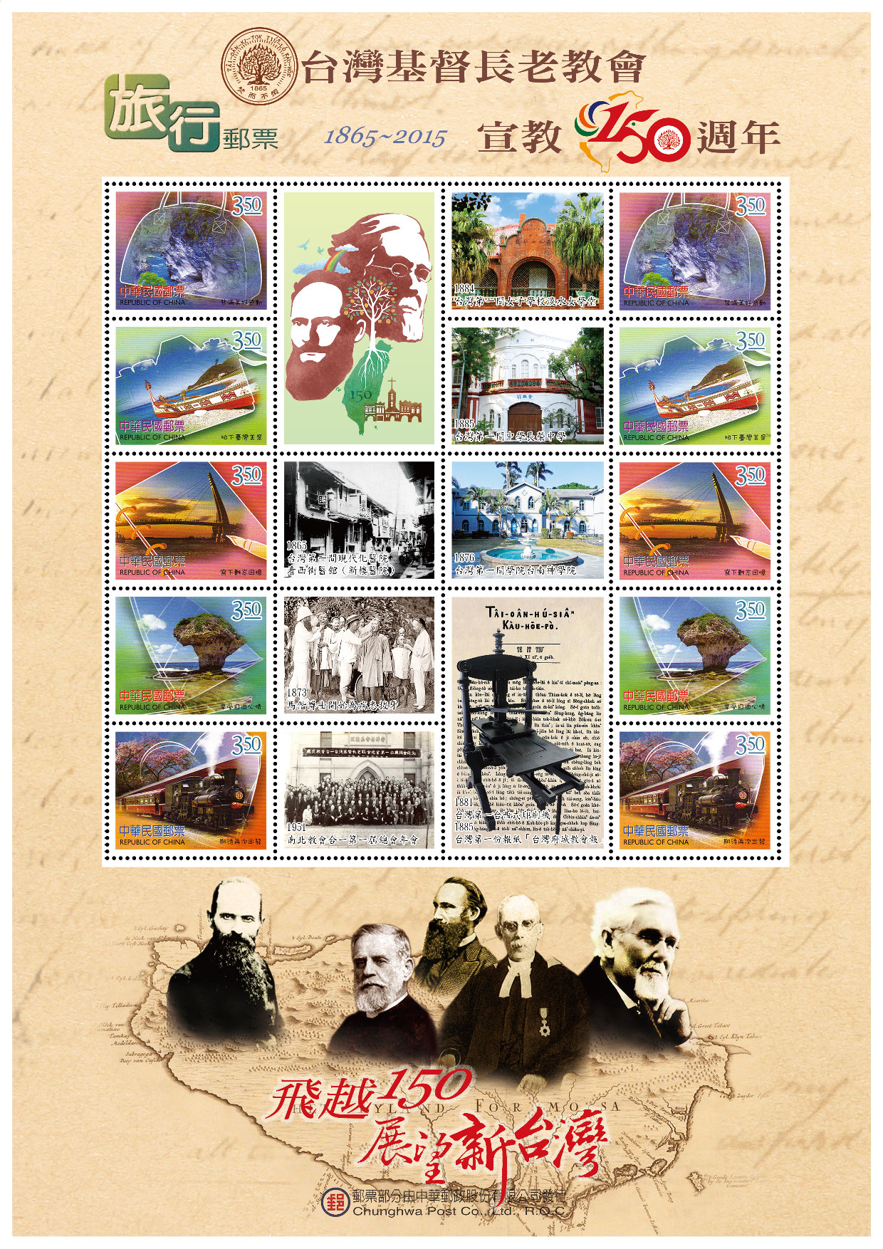 台灣基督長老教會歡慶宣教150週年,即將於10月24、25日在台南長榮中學舉行「台南教會日」活動,並首次推出「台灣基督長老教會歡慶宣教150週年紀念」郵票,內容涵蓋與台南諸多「第一」的紀錄,如1885台灣第一間中學(長榮中學),1876第一間學院(神學院),1865第一間現代醫院看西街醫館(新樓醫院),1881第一台西式印機,1885第一份報紙(台灣府城教會報)以及1884第一間女子學校淡水女學堂,1873馬偕博士開始為病患拔牙,1951南北教會合一第一屆總會年會等珍貴畫面,具有時代、歷史與傳承的深遠意涵。